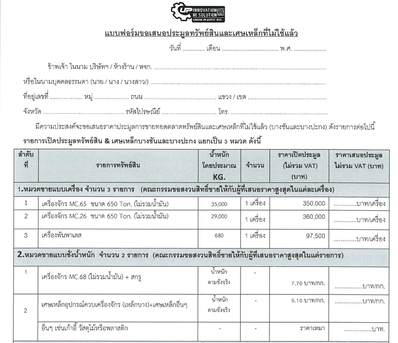 ด้วย บริษัท ยูเนี่ยนพลาสติก จำกัด (มหาชน) มีความประสงค์เปิดขายทอดตลาดทรัพย์สินและ